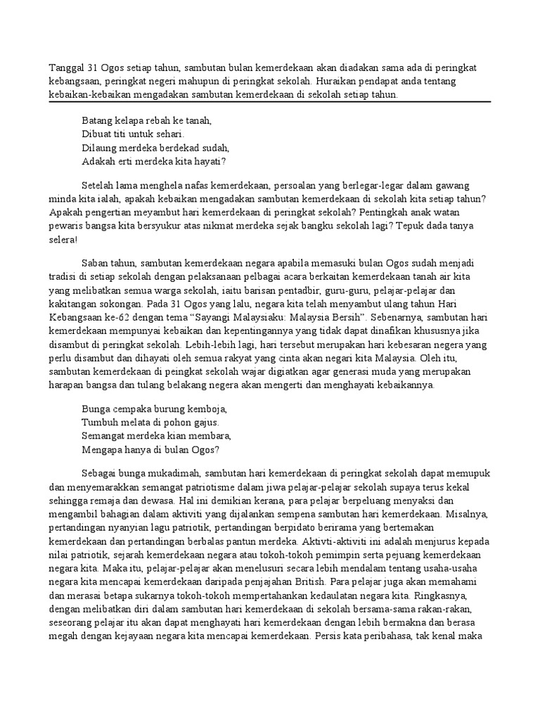 Aku hanya bisa mendengarkan perkataannya. Panjang huraian anda hendaklah antara 200 hingga 250 patah perkataan. Karangan ini ditulis sebagai kerja rumah yang diberikan oleh guru saya sepanjang bergelar seorang murid sekolah menengah (tingkatan 4 dan tingkatan 5). Panjang karangan anda hendaklah antara 200 hingga 250 patah perkataan. Manfaat tempe 3.1 bagi kesehatan 3.2 bagi keuangan 4. Perlukah sudah patah baru hendak melantai? Panjangnya huraian hendaklah antara 200 hingga 250 patah perkataan. Dalam meniti arus kemodenan yang berteraskan sains dan teknologi maklumat, faktor kesihatan masyarakat. Disini admin nak kongsikan bahan tersebut. Contoh karangan perbincangan spm 350 patah perkataan. Bagi calon yang akan menduduki peperiksaan sijil pelajaran. Salah satu pelajaran yang saya minati ketika dibangku sekolah dahulu ialah bahasa inggeris,namun penguasaan saya terhadap bahasa inggeris kurang memuaskan. Sebarkan ini setelah itu, guru bk datang dan menceramahi kami.