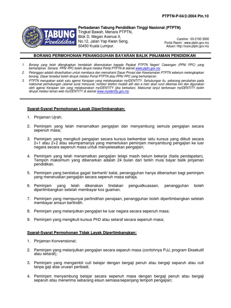 Borang yang telah dilengkapkan hendaklah dikemukakan kepada pejabat ptptn negeri/ cawangan (ppn/ ppc) yang berhampiran. Tempoh penangguhan hanya diberikan 6 bulan pada setiap permohonan dan tidak melebihi tempoh maksimum 24 bulan. Permohonan perlu dikemukakan kepada ptptn melalui surat permohonan rasmi penangguhan atau borang permohonan penangguhan. Apr 04, 2016 · pdf(ptptn) borang permohonan penangguhan bayaran balik popular. Bagi peminjam yang telah diluluskan penangguhan tetapi berhasrat untuk memulakan bayaran balik pinjaman lebih awal, peminjam boleh berunding untuk penstrukturan semula pinjaman.
