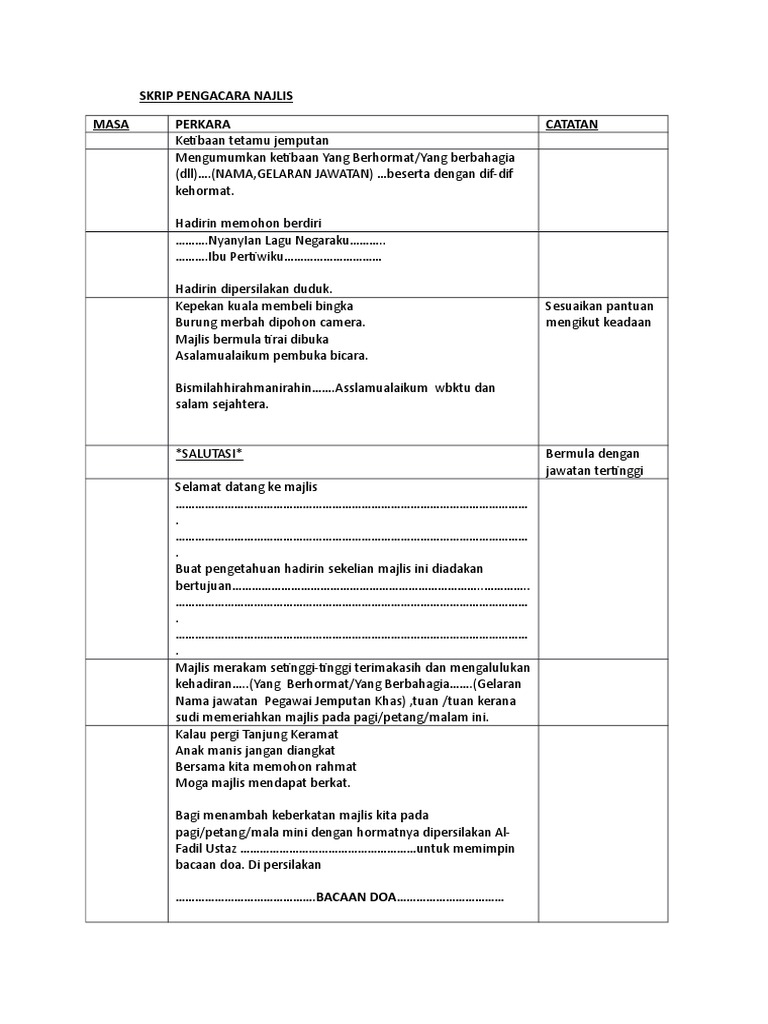 Pengacara Majlis Kursus - Contoh II from lh6.googleusercontent.com Teks pengacara majlis anugerah kece. Pengacara majlis forum perdana sempena maulidur rasul: Sawah menghijau di tengah bendang, tumbuh dipinggir pohon bidara, pemanis kata selamat datang, awal bismillah tuan, saya ambil skrip pengacaraan yg tuan buat sebagai contoh kpd anak didik saya yg akan menjadi pengacara majlis persaraan cikgu di sekolah. Apabila diumumkan ketibaan para tetamu jemputan. Pergi ke dusun memetik kelapa kelapa muda si kelapa barli jari disusun maaf dipinta panjang usia bersua kembali dengan ini. Discover kangmas iku pengacara meaning and improve your english skills! Contextual translation of pengacara majlis into english. If you want to learn kangmas iku pengacara in english, you will find the translation here, along with other translations from javanese to english.
